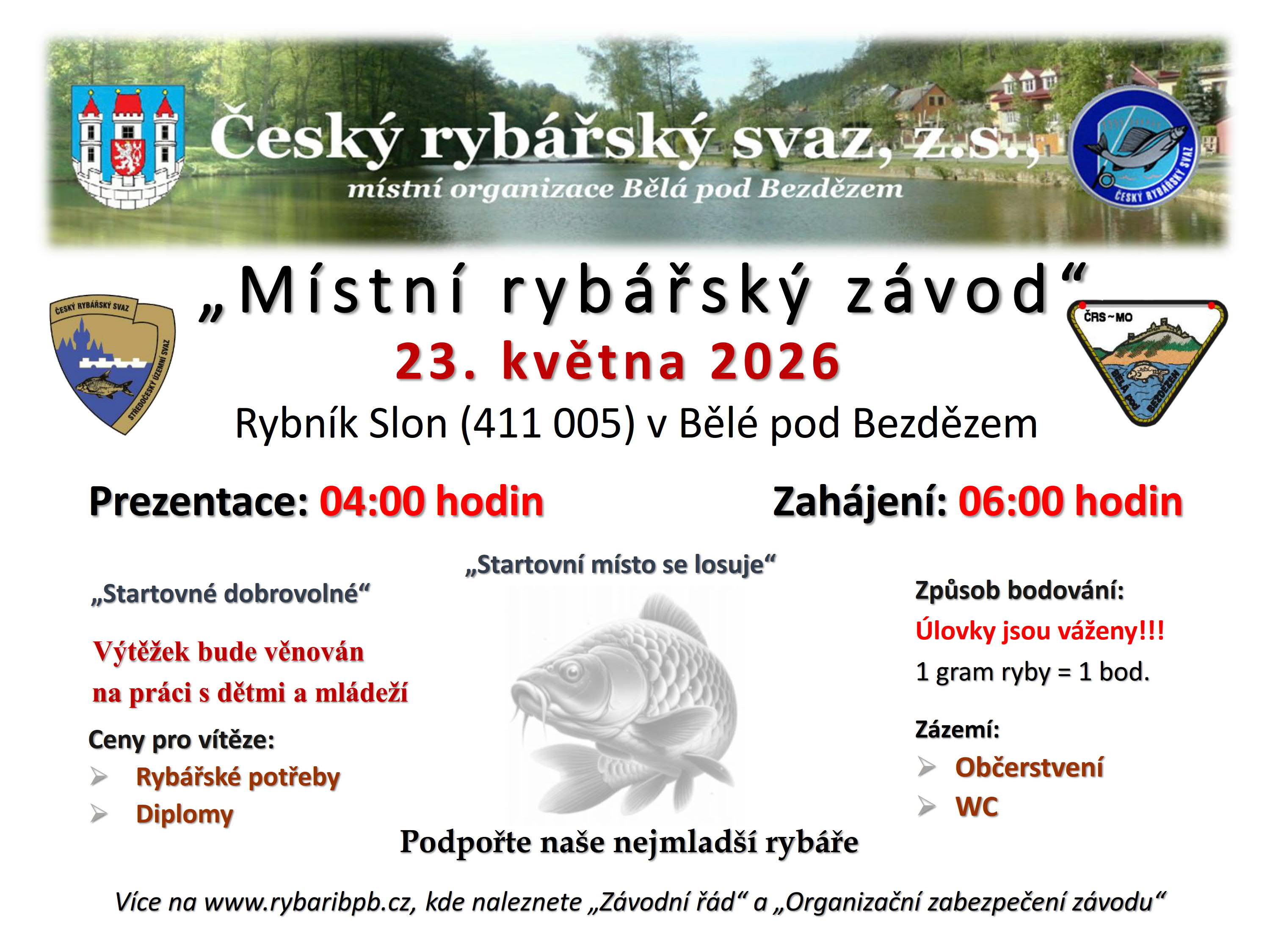 UPOZORŇUJEME, že je nutné si nastudovat závodní řád, kde došlo k některým změnám, kdy byly zavedeny tři kategorie, startovní místa se nelosují, každý si vybírá číslem označené lovné místo sám od 5.00 hod. v den závodu, místa se v poločase nemění a největší změna je v bodování, kdy se nově boduje ulovený druh ryby: kapr, candát štika, amur – 50 b., lín, okoun, síh, pstruh – 20 b., jeseter – 100 b., ostatní (plotice, perlín, karas…) – 5 b. a rovněž pozor na povinnou výbavu!